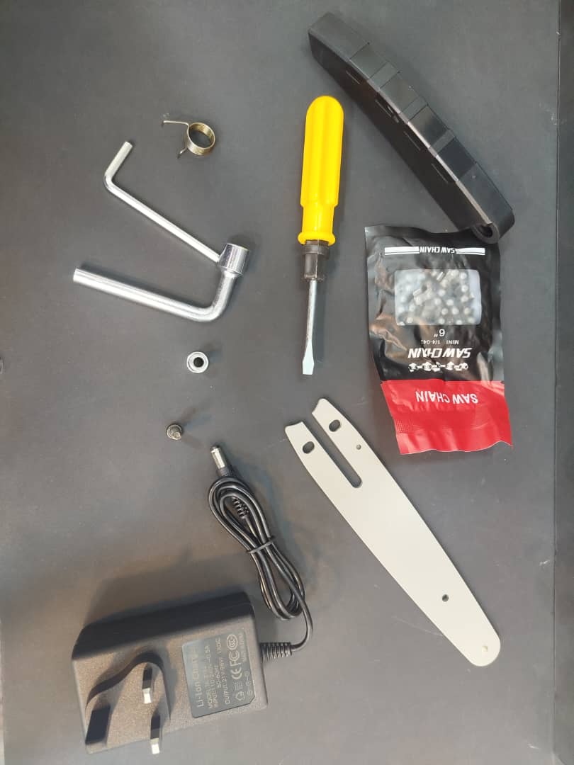 - لوازم جانبی همراه: شارژر، تیغه اضافه، ابزارهای نگهداری و محافظت از ایمنی، شامل عینک و دستکش کار.